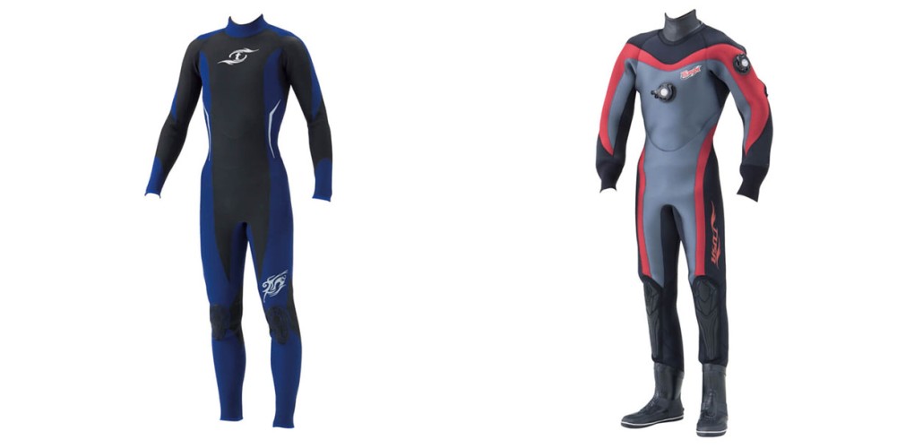 写真左がウエットスーツです。水着の上に着用して使います。レンタル期間は6月~10月頃です。写真右がドライスーツです。服を着た上に着用するブーツまで一体となった完全防水スーツです。レンタル期間は11月~5月頃までです。