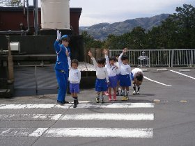 | 4月18日 1・2年生交通教室 交通指導員さんに道の歩き方や横断歩道の渡り方について教えていただきました。自分の身は自分で守れる桃っ子になりましょう。 |