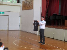 | 5月17日 夢先生(千田健太さん) ロンドンオリンピック フェンシング銀メダリストである千田さんに来ていただき、低学年と高学年に分かれて授業を行いました。また、夢についての講演会も行いました。「目標や夢をどこに設定するかで人生が変わる」と、ご自身の体験から話していただきました。 |